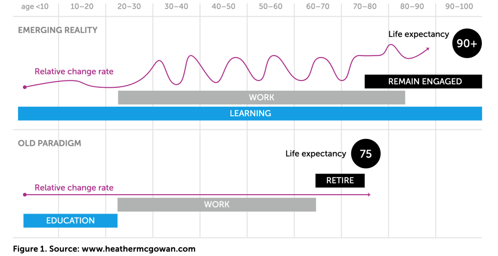 The Employee Revolution The pressure for transformation in our society is caused by two factors: longevity and the accelerated rate of change in our environment. These prevailing megatrends are illustrated in the figure below by McGowan & Shipley. Gone are the days when formal education was the only education anyone needed to succeed. Now and in the future, most learning will take place within organizations and the ecosystems surrounding them. McGowan claims that all of the successful enterprises today are in the learning business8, including e.g Apple, Amazon and Facebook. Lifelong learning is no longer an option, it is a necessity. The transformation illustrated in Figure 1 will hit many industries. The first industries that will be impacted are those that have predictable environments, like operating machinery or preparing fast food. Machines can work more efficiently than humans by collecting and processing data5. Software automation and even more sophisticated forms of AI-based implementations, like Intelligent Automation, will inevitably alter many administrative jobs in the public sector, banking and finance, advanced manufacturing and expertise-based services