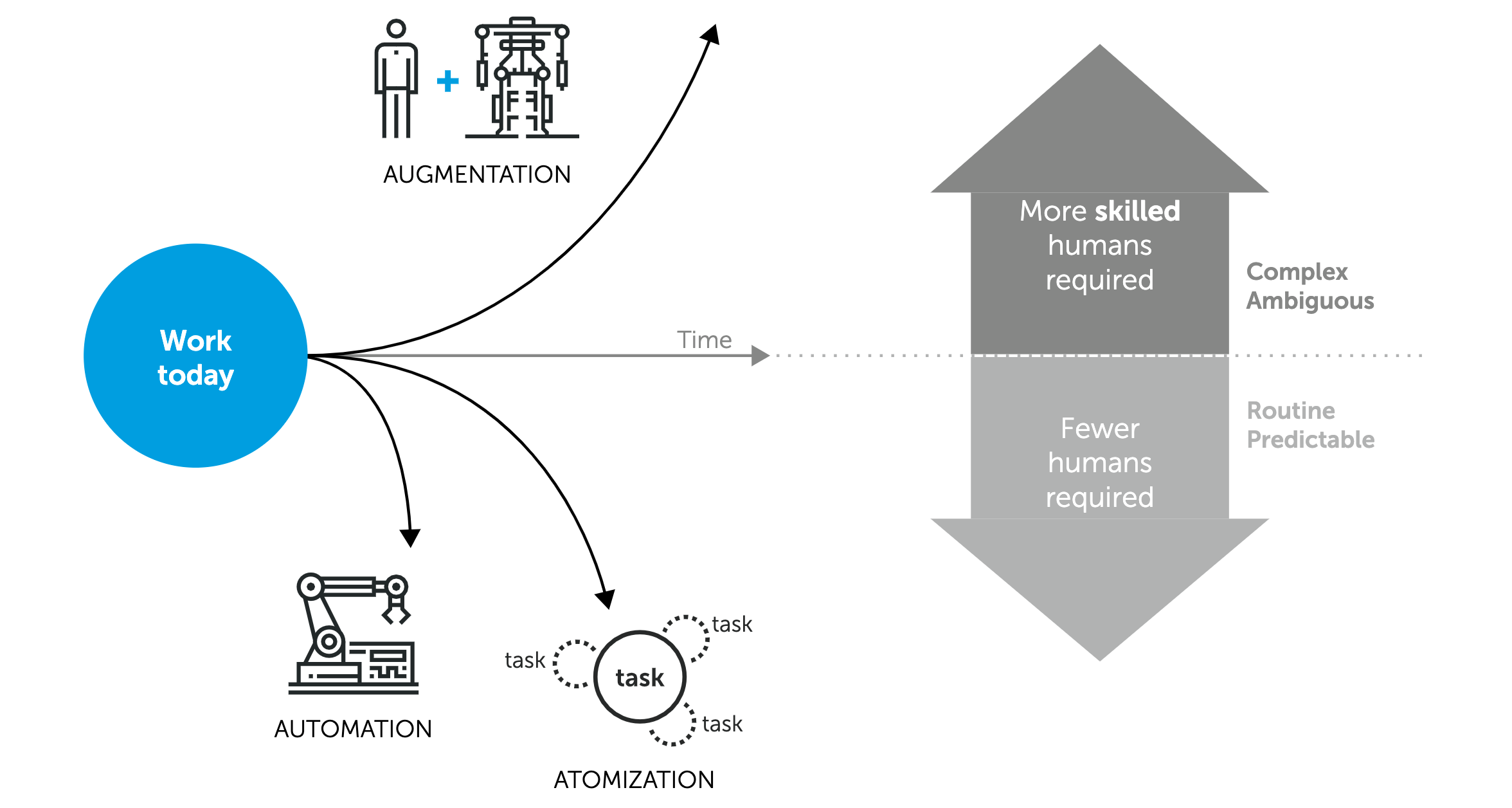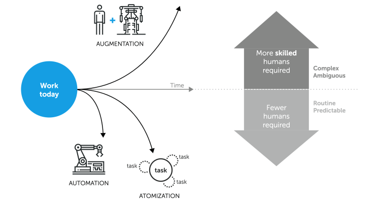In the chart above, McGowan illustrates how in the future more skilled employees are needed to complete complex tasks side-by-side with Artificial Intelligence solutions. On the other end, the work tasks that are routine and predictable can be replaced with automation and those jobs that can’t be automated are split into smaller tasks (atomisation) and given to those who are willing to complete a task at the lowest cost15.