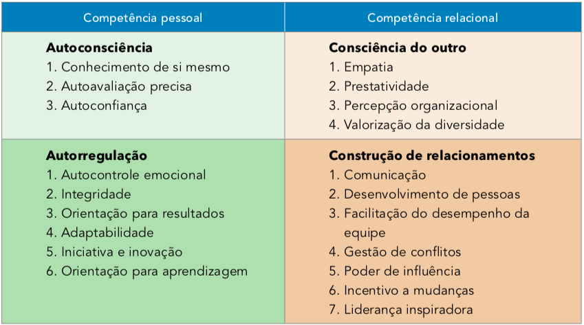 A inteligência emocional tem dois componentes principais: a competência pessoal, centrada no indivíduo, e a competência relacional, centrada nos outros. Em cada um, há duas áreas, conhecimento e gestão, formando quatro quadrantes.